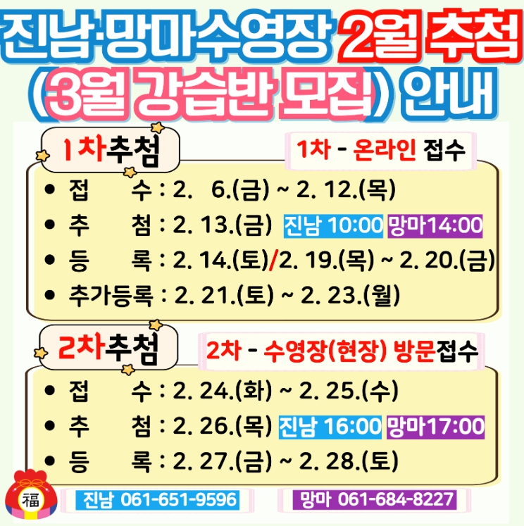 진남수영장과 망마수영장은 2월 12일까지, 웅천수영장은 2월 11일까지 3월 강습반 온라인 접수가 가능하며, 1차 추첨 이후 결원 인원에 한해 2차 방문 접수 및 추첨이 진행된다.