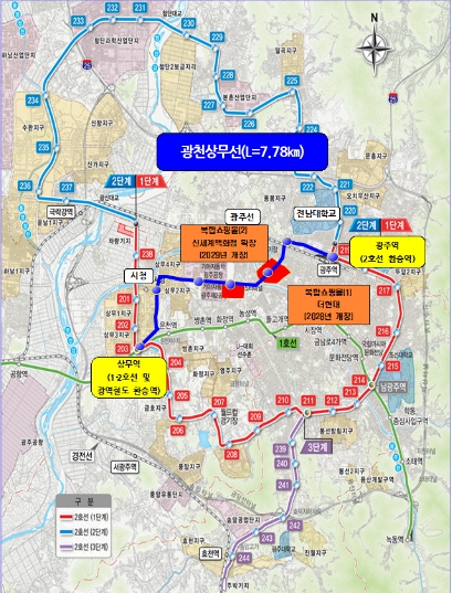 광천상무선은 광주종합버스터미널과 광주기아챔피언스필드 등 기존에 교통 접근성이 상대적으로 취약했던 지역을 촘촘히 연결한다. 또 오는 2028년 개장을 목표로 추진 중인 복합쇼핑몰 조성 등 광천권역 대규모 개발 사업과 연계돼 교통문제 해결과 지역에 활력을 불어넣을 것으로 기대된다.
