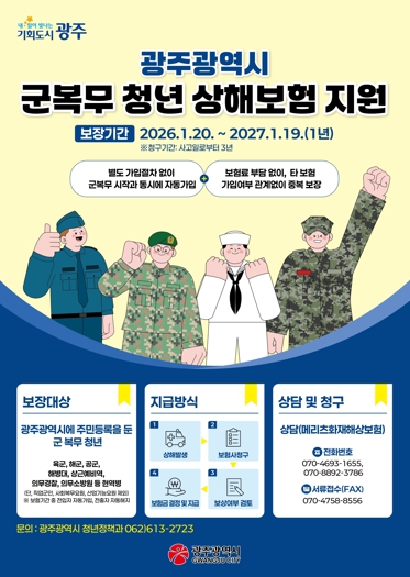 광주시는 광주전남지방병무청, 자치구, 청년 관계기관 등과 협력해 군복무 중인 광주 청년들이 보험 혜택을 받을 수 있도록 홍보물 배부, 누리집 게시 등 지속적으로 홍보할 계획이다.