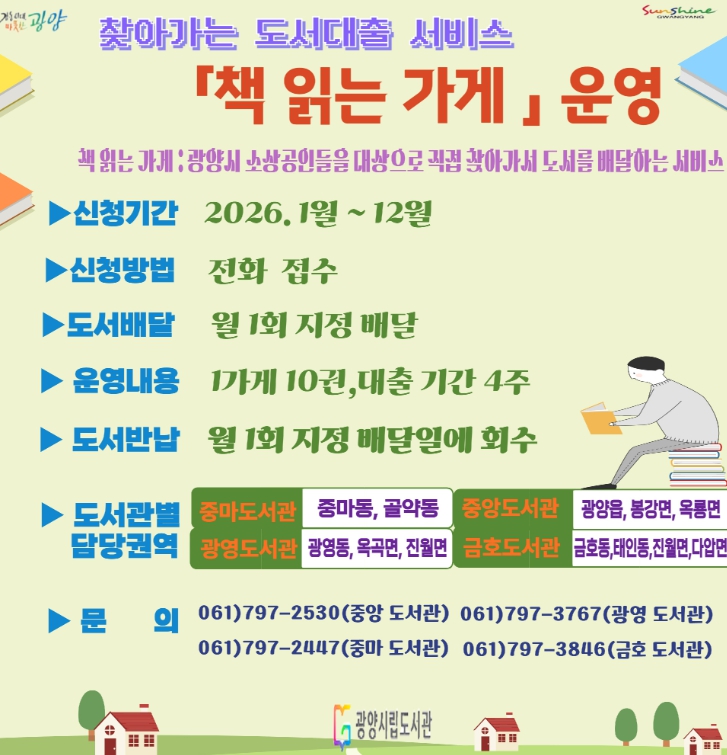 광양시 관계자는 “책 읽는 가게는 도서관이 지역 곳곳으로 한 걸음 더 다가가기 위한 생활 밀착형 독서 서비스”라며 “앞으로도 일상에서 책을 쉽게 만날 수 있도록 다양한 독서문화 프로그램을 지속 확대해 나가겠다”고 밝혔다.