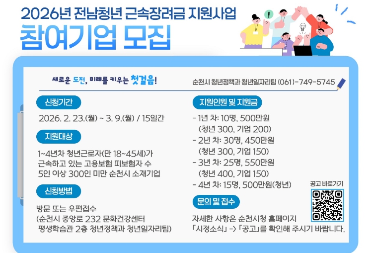 자세한 사항은 순천시청 누리집 [시정소식]에서 [고시/공고] 및 [청년정책 114 홈페이지 새소식]을 참고하거나, 순천시청 청년정책과 청년일자리팀으로 문의하면 된다.