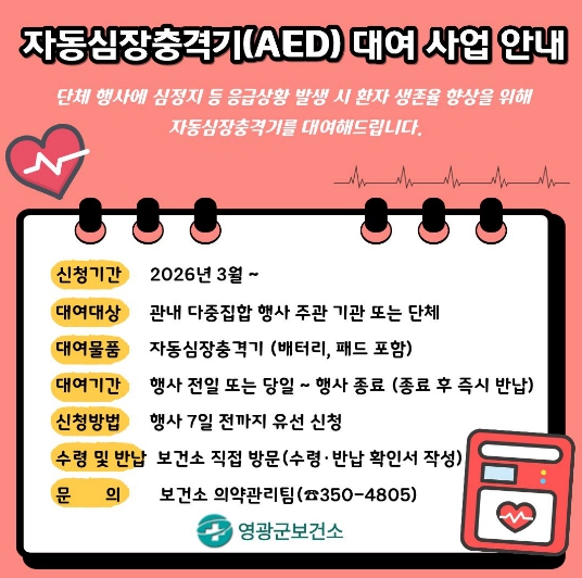 영광군 보건소장은 “심정지 환자는 4분 이내의 신속한 대응이 생존율을 좌우한다”며 “지역행사 현장에 자동심장충격기를 적시에 사용해 군민의 생명보호 및 응급상황 초기 대응 체계를 구축하겠다”고 말했다.