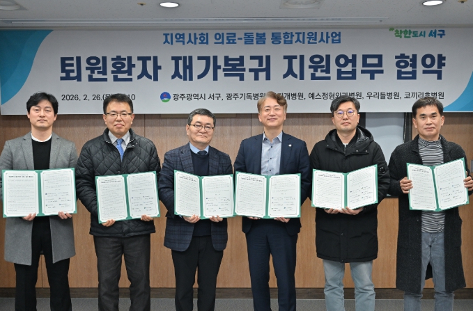 서구는 26일 서구보건소 보건교육장에서 광주기독·무지개·예스정형외과·우리들·코끼리휴병원 등 의료기관 5곳과 ‘퇴원환자 재가복귀 지원을 위한 업무협약’을 체결했다. 이번 협약으로 협력 의료기관은 총 19곳으로 확대됐다.