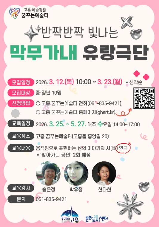 참가 신청은 3월 12일부터 고흥 꿈꾸는예술터 홈페이지 또는 전화로 할 수 있으며, 고흥군에 거주하는 중장년층이라면 누구나 참여 가능하다.