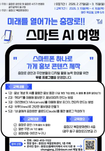 모집 기간은 15일까지이며, 충장로 상인(가게 홍보용 AI 활용을 원하는 상인), 일반 주민(AI 기초 활용 희망자), 중장년 및 어르신 등 관심 있는 누구나 신청할 수 있다.