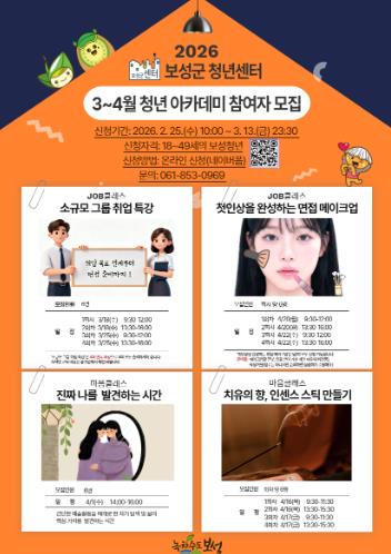 이번 프로그램은 취업 역량 강화와 마음 치유를 주제로 총 4개 과정으로 운영되며, 3월부터 4월까지 보성군 청년센터에서 진행된다.