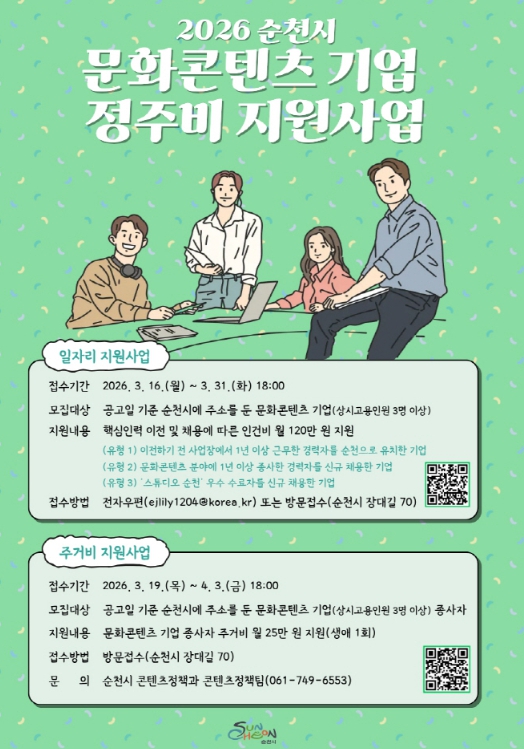 시 관계자는 “이번 정주 지원사업은 이전 콘텐츠 기업들의 현장 수요를 반영해 올해 처음 추진하는 정책”이라며 “기업과 인재가 안정적으로 정착해 성장할 수 있는 환경을 조성해 콘텐츠가 생산되고 머무는 도시, 순천의 미래 산업을 더욱 강화해 나가겠다”고 말했다.