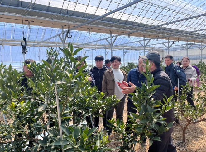 오후에는 관내 만감류 재배 농가 8개소를 순회하며 현장 컨설팅을 실시했다. 각 농가별 재배환경과 생육 상태를 직접 점검하고, 수세 불균형 해소, 착과 관리, 시설 내 환경 조절 등 농가별 문제점에 대한 맞춤형 기술 지도가 이뤄졌다.