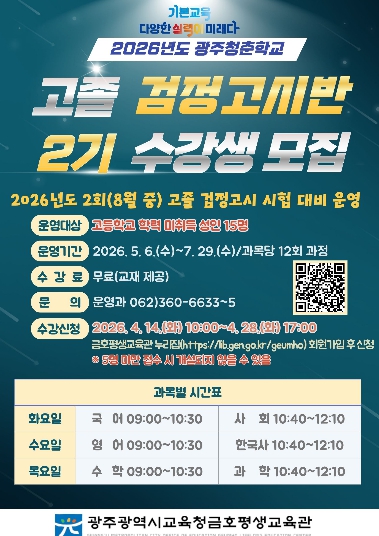 금호평생교육관 정운용 관장은 “검정고시반을 통해 학습자들이 학력 취득의 기쁨을 누리고 배움에 대한 자신감을 얻길 바란다”며 “배움의 열정을 가진 시민들의 꿈과 도전을 응원한다”고 말했다.