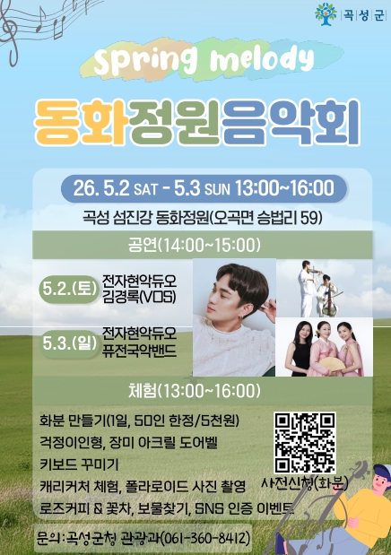 곡성군 관계자는 “봄꽃이 어우러진 동화정원에서 아름다운 음악과 함께 곡성의 매력을 더욱 깊이 느껴보시길 바란다”라고 전했다.