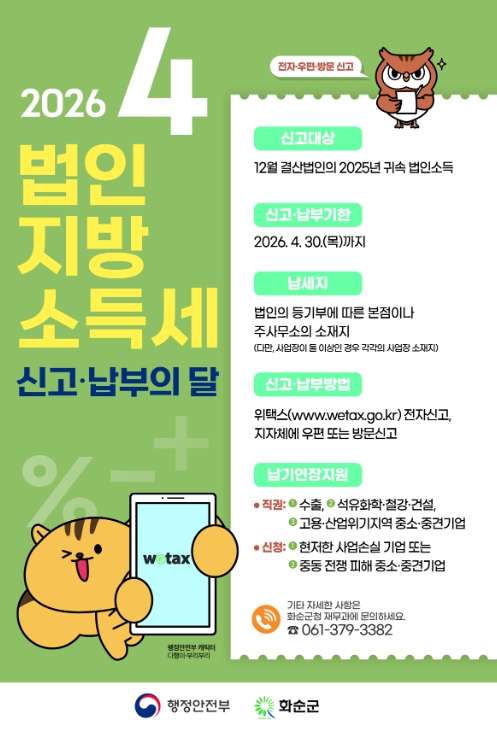 구현진 재무과장은 “법인의 세금 부담 완화를 위해 납부세액이 100만 원을 초과하는 경우 신청을 통해 분할납부할 수 있다”라며, “편리한 위택스를 통해 기한 내 전자신고를 완료하고, 기한 경과로 인한 가산세 등 불이익을 받지 않도록 유의해 주시길 바란다”라고 당부했다.