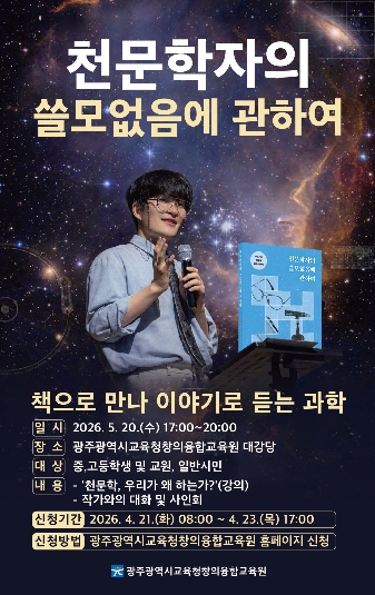 광주창의융합교육원 진영 원장은 “지웅배 교수와의 만남이 학생들이 우주에 대한 호기심을 해소하고 과학적 소양을 넓히는 계기가 되길 바란다”며 “천문학의 가치를 나누는 이번 특강에 많은 학생과 교원의 관심과 참여를 바란다”고 말했다.