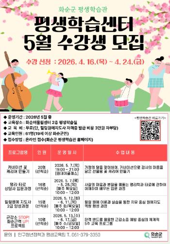 프로그램 일정 및 세부 내용은 화순군청 및 화순군 평생학습관 누리집에서 확인할 수 있으며, 관련 문의는 화순군 인구청년정책과 평생교육팀으로 하면 된다.