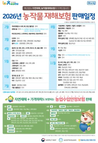 4월부터 벼·대파·고추 등을 시작으로 품목별로 순차 가입이 가능하며, 가입을 바라는 농업인은 가까운 농·축협이나 원예농협에 신청할 수 있다.
