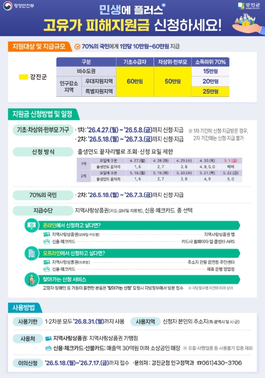 지역사랑상품권은 강진군 내 가맹점에서 사용할 수 있고, 신용·체크카드는 연매출 30억원 이하 소상공인업체 등에서 가능하다. 사용기한은 2026년 8월 31일까지이며, 기한 내 사용하지 못 할 경우 지원금은 소멸한다.