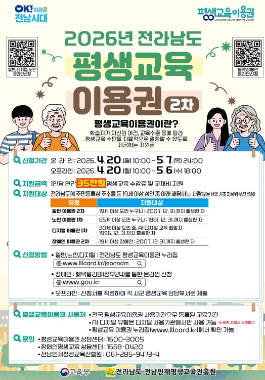신청 기간은 4월 20일부터 5월 6일까지며 평생교육이용권 누리집에서 온라인 접수 또는 여수시 평생학습관으로 방문 접수로 가능하다.