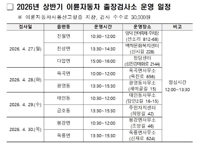 광양시 관계자는 “이륜자동차 정기검사는 배기가스 관리와 안전기준 준수를 위해 꼭 필요한 검사”라며 “검사소 방문이 어려운 주민들이 이번 출장검사소를 이용해 기간 내 검사를 받으시길 바란다”고 말했다.