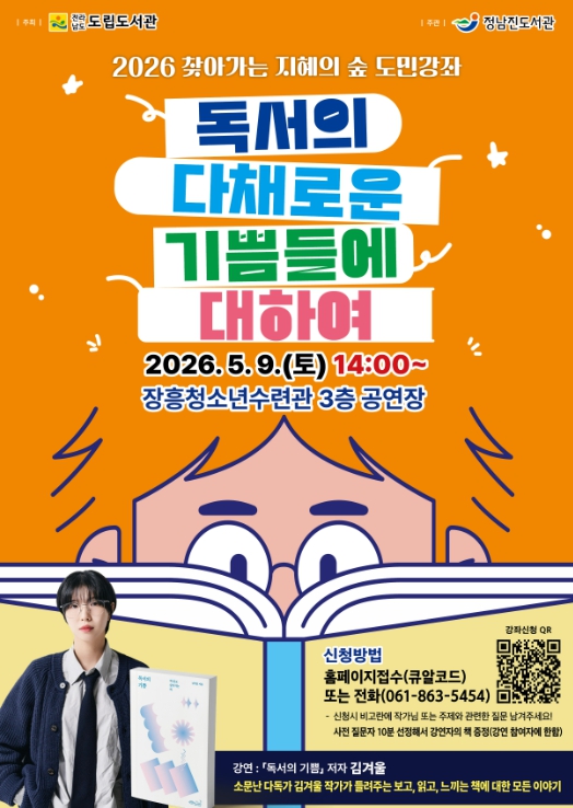 장흥군 정남진도서관은 오는 5월 9일 오후 2시 장흥청소년수련관 공연장에서 북튜버이자 작가인 김겨울을 초청해 ‘2026년 찾아가는 지혜의 숲 도민강좌’를 개최한다고 밝혔다.