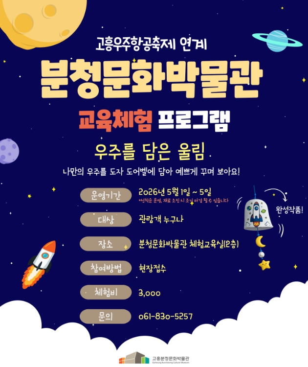 이번 프로그램은 대한민국 대표 우주항공도시로 자리한 고흥의 지역적 특색과 분청문화박물관의 체험교육 기능을 접목해, 참가자가 도어벨을 직접 제작하고 우주를 주제로 한 그림을 그려 넣어 자신만의 작품을 완성하는 체험형 교육으로 구성했다.
