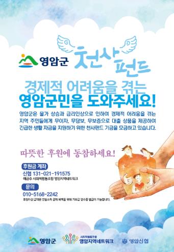 김선미 영암군 인구청년과장은 “천사펀드는 군민 한 분 한 분의 정성이 모여 만들어진 영암형 상생복지 모델”이라며 “도움이 필요한 이웃에게 실질적인 지원이 이어질 수 있도록 기부문화 확산에 많은 관심과 참여를 부탁드린다”고 말했다.