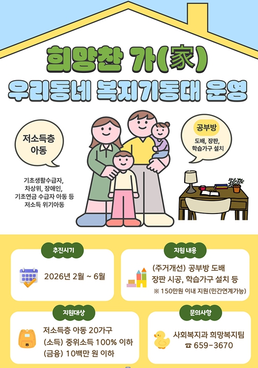 선정된 대상자에게는 도배·장판 시공 등 주거환경 정비를 비롯해 책상·책장 등 학습 가구 설치와 소방·안전 점검을 지원한다.