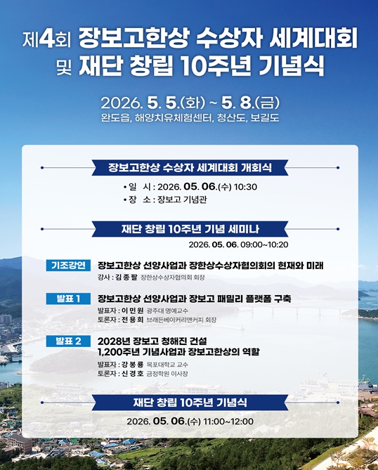 특히 6일 오전 9시 장보고기념관에서 ▲장보고한상 선양 사업과 장한상수상자협의회의 현재와 미래(김종팔 장한상수상자협의회 회장) ▲장보고한상 선양사업과 장보고패밀리플랫폼구축(이민원 전 국가균형발전 위원장, 전용희 브래든베이커리앤커피 회장) ▲2028년 장보고 청해진 건설 1,200주년 기념사업과 장보고한상의 역할(강봉룡 목포대학교 명예 교수, 신경호 금정학원 이사장)의 발표와 토론이 있을 예정이다.