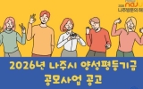 [뉴스맘]전남 나주시가 일·생활 균형과 양성평등 문화 확산, 돌봄과 안전 복지 지원을 위한 ‘2026년 나주시 양성평등기금 공모사업’을 추진한다. 19일 나주시에 따르면 이번 공모사업은 일자리 창출과 일·생활 균형, 양성평등 문화 확산, 돌봄·안전·복지 지원, 지역특화사업 등 총 4개 분야를 대상으로 진행된다. 올해 지원 규모는 4천만 원으로 사업 내용과 예산 편성에 따라 사업별 최대 1천만 원까지 지원하며 단체별 1개 사업에 한해 신청할 수 있다. 신청 자격은 공고일 기준 나주시에 주소를 두고 있는 비영리법인 또는 비영리민간…