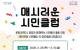 장흥 전향윤 기자2026. 03.03[뉴스맘]광양문화도시센터는 시민의 자발적인 문화활동을 지원하기 위해 2026년 상반기 활동을 함께할 '매시러운 시민클럽' 7기의 참여팀을 모집한다. '매시러운 시민클럽'은 2023년부터 운영해 온 광양문화도시센터의 대표 사업으로, 취향을 기반으로 한 시민의 자발적인 모임 활동을 지원하는 프로그램이다. 그동안 다양한 분야의 시민이 참여해 일상 속에서 문화 활동을 이어왔으며, 참여자 만족도가 높은 사업으로 운영되고 있다. 신청 대상은 취향·선호도·여가 등을 기반으로 한 3인 이상이 구성한 시민모임이다. 활동 주제와 방식, 운영 계획…