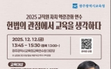 교육 전향윤 기자2025. 12.02[뉴스맘]광주시교육청은 오는 12일 오후 1시45분부터 광주시교육청교육연수원 대강당에서 문형배 전 헌법재판관을 초빙해 ‘교직원 자치 역량 강화 연수’를 개최한다. 이번 연수는 시교육청의 ‘헌법과 민주주의 수호 기간’을 맞아 헌법적 가치에 기반한 민주적 학교 자치 실현을 위해 마련됐다. 문 전 재판관은 ‘헌법의 관점에서 교육을 생각하다’라는 주제로 민주적 교육 현장에서 요구되는 자율성·책임성·민주성의 의미를 소개할 예정이다. 시교육청은 이날 연수에 앞서 헌법 수호의 의미를 다지기 위한 ‘헌법 조항 쓰기 릴레이’ 행사도 진행한…