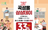 곡성 전향윤 기자2026. 02.23[뉴스맘] 전남 곡성군은 3월 3일 삼겹살데이를 맞아 곡성군 공식 온라인 쇼핑몰 ‘곡성몰’에서 ‘삼삼데이 특별전’을 운영한다고 23일 밝혔다. 이번 특별전은 축산물 소비가 증가하는 시기에 맞춰 지역 축산농가의 판매 기반을 확대하고, 소비자에게는 우수한 지역 축산물을 합리적인 가격에 제공하기 위해 마련됐다. 참여업체의 자체 할인과 곡성군의 추가 할인 지원을 결합해 최대 33% 할인 혜택을 제공한다. 이번 행사에는 5개 업체가 참여해 한우, 흑돼지, 떡갈비, 유정란 등 총 27개 품목을 선보인다. 곡성몰 내에는 전용 …