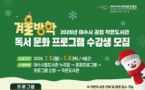 경제 전향윤 기자2025. 12.31[뉴스맘]여수시가 운영하는 5개 공립 작은도서관에서 오는 2026년 1월 5일부터 8일까지 ‘겨울방학 독서문화 프로그램’ 수강생 106명을 선착순 모집한다. 이번 프로그램은 방학을 맞아 학생과 성인을 대상으로 독서를 통해 창의력·사고력을 증진하기 위한 다양한 독서문화 프로그램으로 마련됐다. 운영 기간은 오는 2026년 1월 12일부터 2월 24일까지며 프로그램별 기간이 다르다. 운영 작은도서관은 ▲여문늘벗(구 중부보건지소) ▲꿈을키우는(미평 선경 3차 아파트) ▲화양열린(화양면민회관 2층) ▲청솔글누리(돌산 청솔 2차 아파트) …
