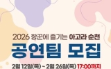 순천 전향윤 기자2026. 02.12[뉴스맘](재)순천문화재단은 오는 26일까지 ‘2026 항꾼에 즐기는 아고라 순천’ 문화예술 공연팀을 공개 모집한다고 밝혔다. 올해로 14년째 진행되는 아고라 순천은 그동안 축적해 온 열린 무대경험을 바탕으로 일상에서 시민 누구나 접근 가능한 공공 공연 플랫폼으로 지역 예술인들이 지속적으로 성장할 수 있는 지역 대표 공연 브랜드로 자리매김했다. 이번 공모는 사업 공고일 기준 순천시 거주 예술가(예술단체)로 해당 분야 전공자 등 공연 역량을 갖춘 개인 및 단체라면 지원할 수 있다. 모집 규모는 총 5개 장르 ▲대중음악 ▲양악 …