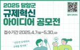 광양 전향윤 기자2025. 04.07[뉴스맘]담양군은 군민의 일상생활과 기업 경제활동에 걸림돌이 되는 불합리한 규제를 개선하기 위해 '2025년 담양군 규제혁신 아이디어 공모전'을 개최한다고 밝혔다. 이번 공모전은 ▲안전·복지 향상, ▲일상생활 불편 해소, ▲취업·일자리 창출 및 기업활동 애로사항, ▲신산업·지역경제 활성화 저해 등 규제 개선이 필요한 전 분야를 대상으로 한다. 규제 개선에 관심 있는 누구나(주민, 소상공인, 기업 등) 참여할 수 있으며, 접수 기간은 7일부터 5월 30일까지이다. 참여 희망자는 담양군청 누리집의 공고문을 참고해 전자우…