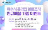 경제 전향윤 기자2026. 03.18[뉴스맘]여수시가 오는 3월 31일까지 ‘온라인 설문조사 신규 패널 가입 이벤트’를 실시한다고 밝혔다. 시에 따르면 시정 정책 전반에 시민의 의견 수렴하기 위해 온라인 설문조사를 추진 중이며 ‘온라인 설문조사 패널’에 가입하면 각종 설문조사에 참여할 수 있다. 이벤트 기간은 오는 3월 31일까지이며 여수시민이면 누구나 가입 가능하다. 패널 가입은 이벤트 기간 이후에도 연중 가입할 수 있다. 가입 방법은 아래 QR코드를 통해 접속하거나 여수시 온라인 설문조사 누리집에 접속한 뒤 우측 상단 ‘패널 가입하기’를 클릭해 휴대폰 인증과…