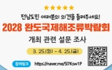 여수 전향윤 기자2025. 03.28[뉴스맘]완도군은 ‘2028완도국제해조류박람회’에 대한 전남도민 인식 설문 조사를 4월 25일까지 실시한다. 군은 설문 조사를 통해 박람회에 대한 도민 관심도와 기대 효과, 참여 의향 등을 분석하여 국제 행사 승인을 위한 자료로 활용할 계획이다. 설문 항목은 국제해조류박람회에 대한 인지도 및 관심도, 전남 해조류 산업의 글로벌 경쟁력 가능성, 참여 희망 콘텐츠 및 프로그램 유형 등 35개이다. 설문 조사는 온라인 또는 QR코드를 통해 모바일로도 할 수 있다. 군 관계자는 “설문조사는 2028완도국제해조류박람회의…