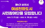 순천 전향윤 기자2025. 03.25[뉴스맘]순천시는 건강하고 행복한 여성친화도시 조성을 위해 ‘제4기 여성친화도시 시민참여단’을 4월 18일까지 모집한다고 밝혔다. 시민참여단은 ‘여성친화도시 순천’을 목표로 시민이 주체가 되어 운영되며, 여성친화도시 추진사업에 대한 홍보 및 의견수렴, 양성평등마을 공모사업 등을 통해 성평등 문화 확산 및 도심 안전 모니터링, 생활 불편사항 개선 건의 등의 역할을 수행할 예정이다. 임기는 2년으로 순천시에 거주하는 만 19세 이상 시민이면 누구나 지원할 수 있다. 모집인원은 50명으로 성별, 연령, 활동경력 등을 고려해 다양한…