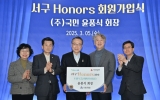 동구 전향윤 기자2025. 03.05[뉴스맘]윤풍식 ㈜국민 회장이 광주 서구의 고액 기부자 모임인 ‘서구아너스’에 가입했다. 서구는 5일 오전 서구청 1층 기부자 명예의 전당에서 광주사회복지공동모금회와 함께 서구아너스 가입식을 개최했다. 이 자리에서 윤 회장은 앞으로 5년간 매년 1000만원씩 총 5000만원을 후원하기로 약정했다. 후원금은 복지 사각지대 없는 따뜻한 공동체 착한 서구를 위한‘서구아너스 012 파트너스’민관협력사업에 사용될 예정이다. 윤 회장은 1991년 ㈜국민을 설립해 정보통신과 전기, 건설, 레저, 면세 분야까지 사업을 확장하면서 끊임없는 도전…