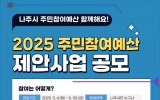무안 전향윤 기자2025. 03.04[뉴스맘]전라남도 나주시는 내년도 예산 편성을 위한 2025년도 주민참여예산 사업 공모 접수를 오는 5월 30일까지 실시한다고 4일 밝혔다. 올해 주민참여예산 규모는 총 30억 원 이내로 시민들의 삶의 질을 높이고 지역 발전에 기여할 수 있는 다양한 사업을 발굴하는 것이 목적이다. 특히 시 정책사업, 주민 불편 해소를 위한 읍면동 특성화 사업 등 시민들의 삶의 질을 높이고 지역 발전에 실질적인 영향을 줄 수 있는 사업을 중점적으로 모집한다. 이번 공모는 나주시민뿐만 아니라 나주에서 영업소를 운영하는 기업의 임직원도 참여할 수 …