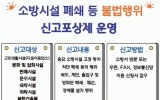 장흥 전향윤 기자2025. 03.04[뉴스맘]장흥소방서에서는 군민들의 안전을 지키기 위해 소방시설 폐쇄 등 불법행위 신고포상제를 연중 운영한다고 밝혔다. 이번 제도는 근린생활시설, 문화 및 집회시설, 판매시설, 운수시설, 숙박시설, 위락시설, 복합건축물, 의료시설, 노유자시설 등 다양한 시설에서 발생할 수 있는 불법행위에 대한 군민들의 적극적인 신고를 유도하고 있다. 신고포상제의 주요 목적은 비상구 폐쇄와 같은 불법행위로부터 군민들의 안전을 보호하고, 관계자들의 경각심을 높여 화재 발생 시 인명피해를 최소화하는 것이다. 신고대상 주요 불법행위에는 △비상구 폐쇄(잠금…