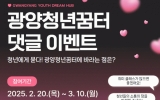 광양 전향윤 기자2025. 02.21[뉴스맘]광양시와 광양청년꿈터가 지역 청년들의 목소리를 직접 듣기 위해 오는 3월 10일까지 ‘양청년꿈터 댓글 이벤트’를 진행한다. 광양시에 거주하는 18세부터 45세까지의 청년이라면 누구나 이번 이벤트에 참여할 수 있다. 참여 방법은 간단하다. 먼저 광양청년꿈터 인스타그램을 팔로우하거나 네이버 블로그를 이웃 추가한 뒤, ‘광양청년꿈터에 바라는 점’ 게시글에 희망 프로그램이나 청년정책에 대한 의견을 댓글로 작성하면 된다. 이후, 팔로우 인증과 댓글 작성 화면을 네이버 폼으로 제출하면 참여가 완료된다. 휴대전화 번호당 1회…