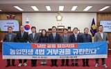 정치 전향윤 기자2024. 12.20[뉴스맘]무안군의회는 20일 한덕수 대통령 권한대행의 거부권 행사와 관련해 성명을 내고 "내란 공범 혐의자의 농업.민생 4법 거부권행사를 강력히 규탄한다”고 밝혔다. 이번 성명은 지난 19일 한 권한대행이 국무회의를 열고 농업 4법(양곡관리법·농수산물 유통 및 가격 안정에 관한 법·농어업 재해 대책법·농어업 재해 보험법)에 대한 재의요구안을 의결한 데 따른 것이다. 군의회는 성명서를 통해 “농민은 기후 재난과 생산비 폭등, 쌀값 폭락으로 소상공인은 얼어붙은 경기와 계엄 후폭풍으로 벼랑 끝에 서 있다”며 “내란 공범 혐의자에 의해…