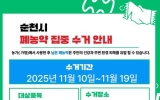 화순 전향윤 기자2025. 11.06[뉴스맘]순천시는 농가와 가정에서 사용 후 남은 폐농약과 유효기간이 지난 농약을 안전하게 수거하기 위해 폐농약 집중수거 기간을 운영한다고 밝혔다. 집중수거 기간은 오는 10일부터 19일까지이며, 수거는 읍・면 행정복지센터와 순천시 업사이클센터 더새롬에서 수거가 진행된다. 농민과 시민은 가까운 수거장소를 이용해 폐농약을 안전하게 배출할 수 있다. 이번 사업은 농가에 방치되기 쉬운 폐농약을 체계적으로 수거・처리해 환경오염을 예방하고 시민 안전을 강화하는 데 목적이 있다. 수거된 폐농약은 폐기물 전문처리업체를 통해 안전하게 처리되…