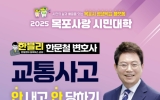 목포 전향윤 기자2025. 11.06[뉴스맘]목포시는 오는 11월 11일 오후 2시 목포시민문화체육센터에서 한문철 변호사를 초청해 ‘교통사고 안 내고 안 당하기’를 주제로 특강을 연다. 이번 강연은 목포시와 국립목포대학교가 공동 운영하는 '목포사랑 시민대학' 강좌의 일환으로 마련됐다. JTBC ‘한블리(한문철의 블랙박스 리뷰)’로 잘 알려진 한문철 변호사는 교통사고 처리 분야의 대표적인 전문가로, 실제 사고 영상과 판례를 통해 법적 책임 비율, 사고 대처 요령 등 일상에서 도움이 되는 교통법률 정보를 알기 쉽게 전할 예정이다. '목포사랑 시민대학'은 ‘글로컬대…