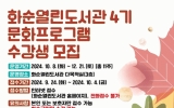 사회 전향윤 기자2024. 09.11[뉴스맘]화순군은 화순열린도서관에서 9월 독서의 달을 맞아 제4기 문화프로그램 수강생을 모집한다고 밝혔다. 일반 대상으로는 △마음을 위로하는 책, 유아 대상으로는 △오감톡톡 아기 오감 놀이 △그림책 냠냠 △미술로 놀자 6개 강좌에 총 65명을 모집한다. 4기 문화프로그램은 10월 8일부터 12월 21일까지 총 11주에 걸쳐 진행된다. 9월 24일부터 10월 4일까지 화순열린도서관 홈페이지를 통해 선착순으로 신청할 수 있으며, 수강료는 무료지만 재료비와 교재비는 수강생이 부담한다. 강삼영 문화예술과장은 “이번 프로그램으로 영유…