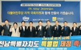 완도 전향윤 기자2024. 07.24[뉴스맘]김영록 전라남도지사와 신정훈 국회의원 등 전남 지역구 국회의원 10명이 24일 서울서 ‘전남특별자치도 특별법 제정 촉구 성명서’를 발표, 지방소멸 위기 극복을 위한 실질적 자치권한 부여 등을 강조했다. 이들은 성명서에서 “지난 3월, 전남도 인구는 180만 명 아래로 추락해 1970년대 400만 명에 달했던 인구가 반세기 만에 절반 이상 사라졌다”며 “합계 출산율이 전국 1위(0.97명) 임에도 고령화율 전국 1위, 매년 8천 명의 청년 인구유출과 지역내총생산(GRDP) 88조 원 중 21조 원 역외 유출까지 삼중·사중고…