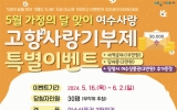여수 전향윤 기자2024. 05.20[뉴스맘]여수시가 5월 가정의 달을 맞아 오는 6월 2일까지 ‘여수사랑 고향사랑기부제 특별 이벤트’를 진행한다. 이벤트는 10만 원 이상 고향사랑 기부자를 대상으로 30명을 추첨해 여수상품권 3만원을 추가로 제공하는 행사다. 참여방법은 10만 원 이상 기부하고 답례품 선택을 완료하면 자동으로 응모된다. 시는 당첨 결과를 6월 중으로 시청 누리집에 공개하고 대상자에 개별 연락할 계획이다. 차주민 징수과장은 “가정의 달, 국내 최고의 관광도시 여수를 방문하시면서 여수에 대한 관심과 사랑으로 고향사랑기부제에도 많은 동참을 바란다”…