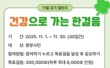 광양 전향윤 기자2025. 10.21[뉴스맘]광양시는 지역 주민의 건강생활 실천을 돕기 위해 11월 1일부터 30일까지 모바일 걷기 앱 '워크온'에서 ‘건강으로 가는 한걸음 11월 걷기 챌린지’를 운영한다고 밝혔다. 이번 걷기 챌린지는 1걸음당 1마일리지가 적립되며, 1일 최대 8천 마일리지가 누적된다. 기간 중 20만 보를 달성하면 20만 마일리지가 쌓여 모바일상품권(5천 원권) 응모가 가능하다. 시는 목표 걸음을 달성한 참여자 중 추첨을 통해 800명에게 상품권을 지급할 예정이다. 참여를 희망하는 시민은 모바일 걷기 앱 ‘워크온’을 설치하고 ‘광양시 공…