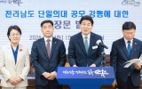 영암 전향윤 기자2024. 05.07[뉴스맘]노관규 순천시장은 정병회 순천시의회 의장, 이병운 국립순천대학교 총장, 더불어민주당 순천?광양?구례?곡성(갑) 김문수 국회의원 당선인, 순천?광양?구례?곡성(을) 권향엽 국회의원 당선인과 함께 전남 동?서 지역간 갈등을 초래한 전남도 단일의대 공모 강행에 대한 공동입장문을 7일 발표했다. 이날 순천시장은 “전남의대를 둘러싼 전남지역 동·서 간 극한 갈등의 모든 책임은 전남도에 있다”고 말했다. “전남도의 일방적이고 성급한 행정이 이번 전남권 의대 문제 사태를 자초했고, 광역 자치단체의 책무인 이해조정과 갈등 해결의 …